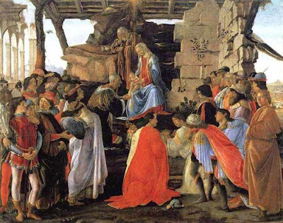 Преуспевающий банкир Гаспаре Лами, близкий к семье Медичи, заказал эту картину живописцу Сандро Боттичелли для фамильного алтаря в церкви Санта-Мария-Новелла во Флоренции. На картине художник должен был изобразить три поколения семейства Медичи, но не забыть про самого Гаспаре и его сына. Впоследствии Боттичелли написал и самого себя - крайний справа в коричневом плаще. Найдите на этой картине Гаспаре и его сына.